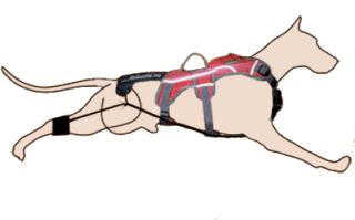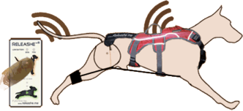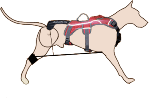 With the push on a button on the transmitter the motor at the chest takes in the lines to thte dogs rear legs within 1-4 seconds.